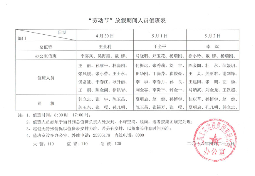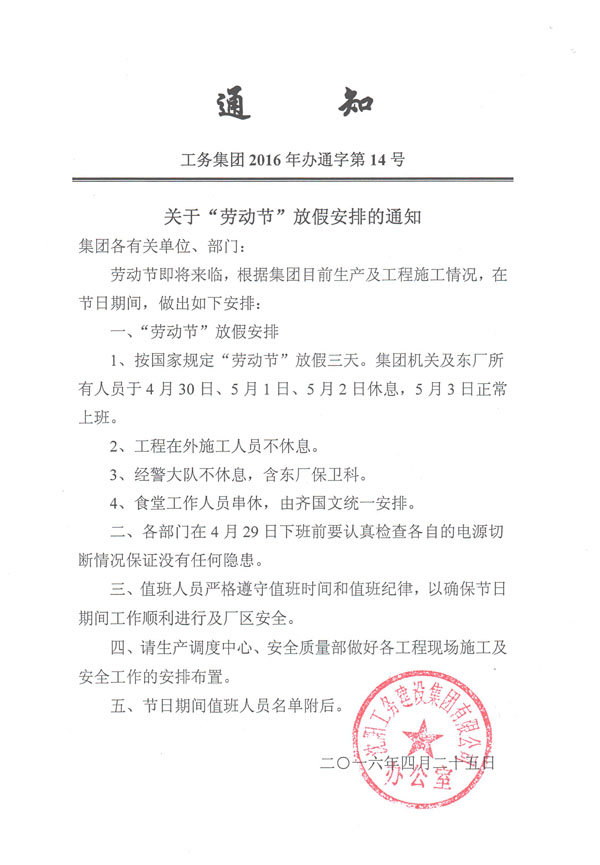 工務集團2016年辦通字第14號《關于“勞動節(jié)”放假安排的通知》
